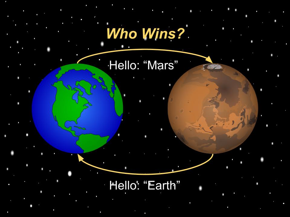 But in our specific example, we have conflicting values of Earth versus Mars, in which case all we want is a deterministic algorithm that every machine in the entire universe is guaranteed to already have in order for us to converge to the same answer without any extra coordination or communication. I want something...
