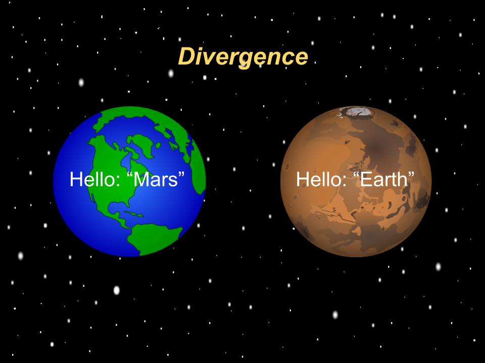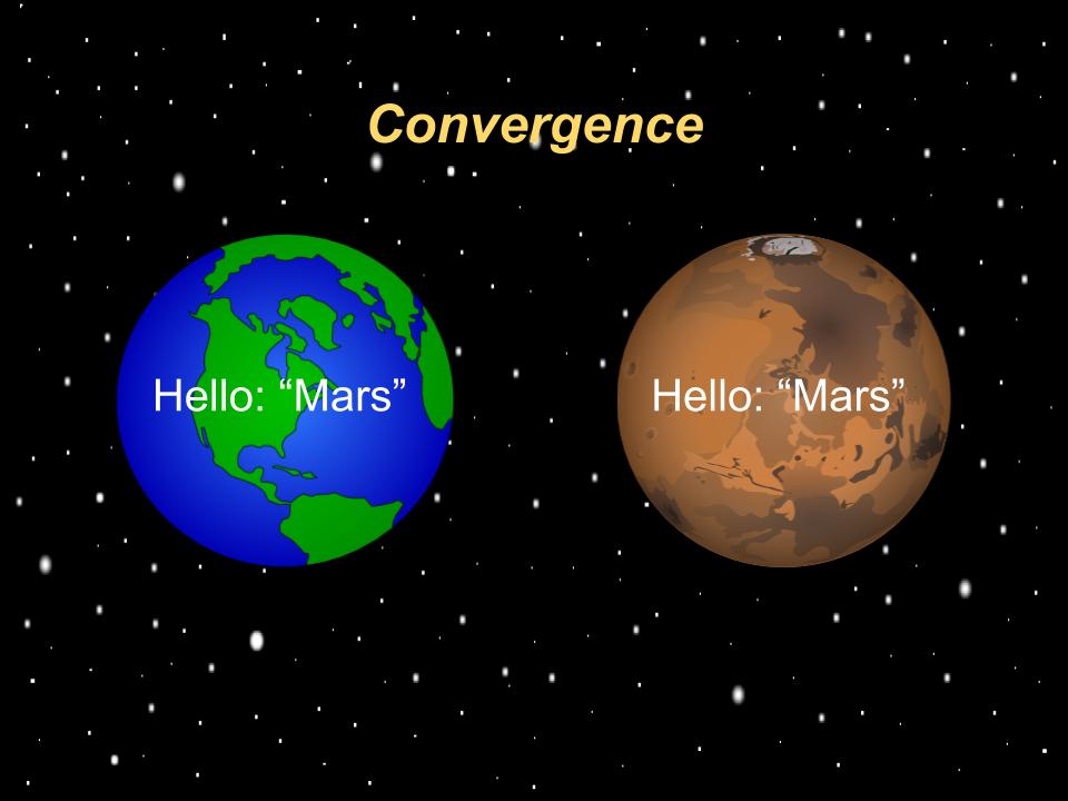 We want to synchronize some data. Such that both Earth and Mars see the same thing. We have a “Hello” property that both worlds share and are updating. Earth updates it to “Hello Mars” simultaneously as Mars updates it to “Hello Earth”. What we get is...